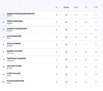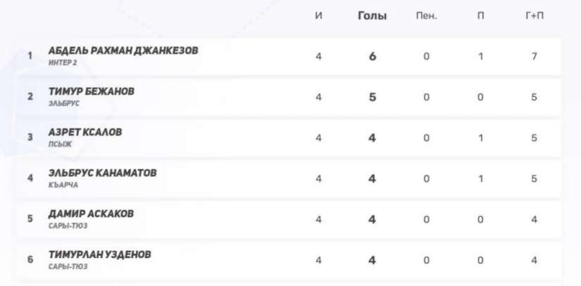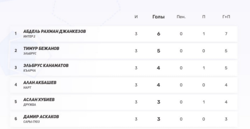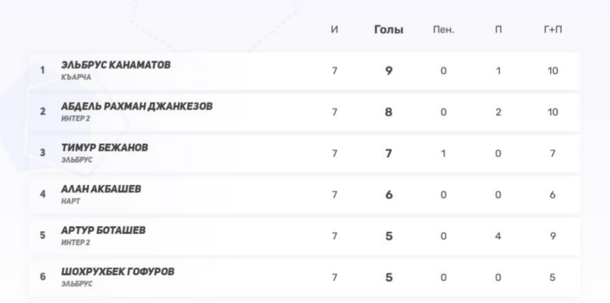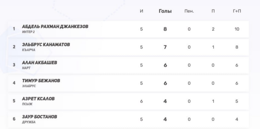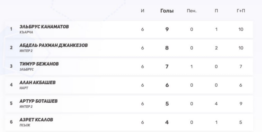 3–4) Алан Акбашев (Нарт), Тимур Бежанов (Эльбрус) — по 6